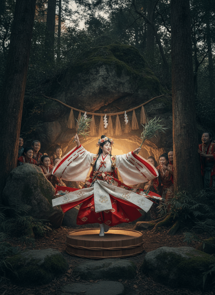 When Amaterasu-Omikami hid herself in the Ama-no-Iwato cave, she was the goddess who danced to open it.
